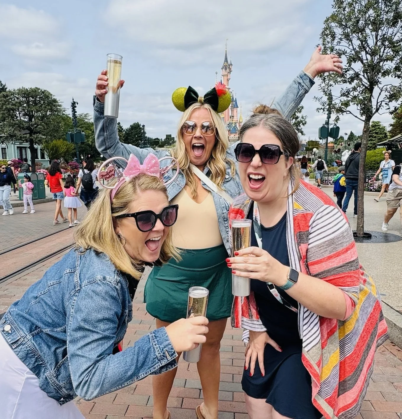 The secret to looking fabulous while drinking champagne on Main Street at Disneyland Paris is having friends like Lindsey and Brittany who understand that when you're living your actual best life, you document it properly. Because let's be honest - if you're going to be three grown women giggling with champagne flutes in the most magical place on earth, you might as well own it completely.