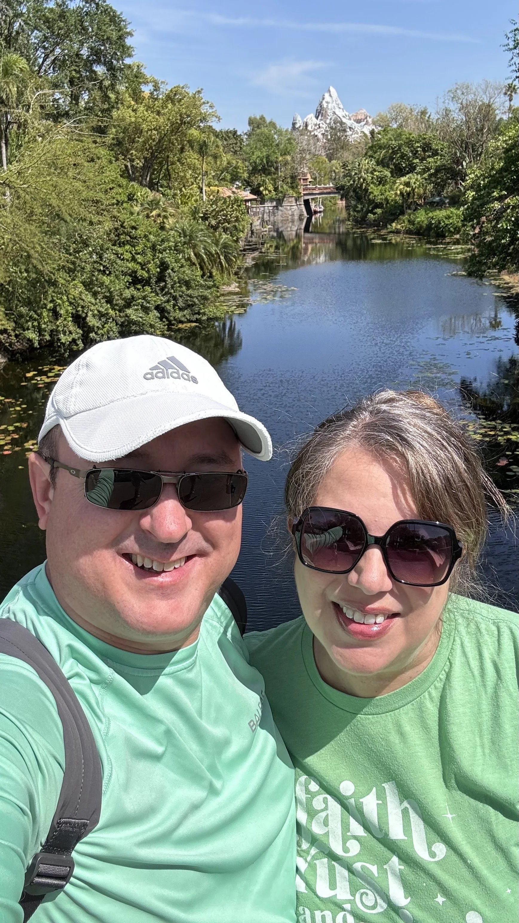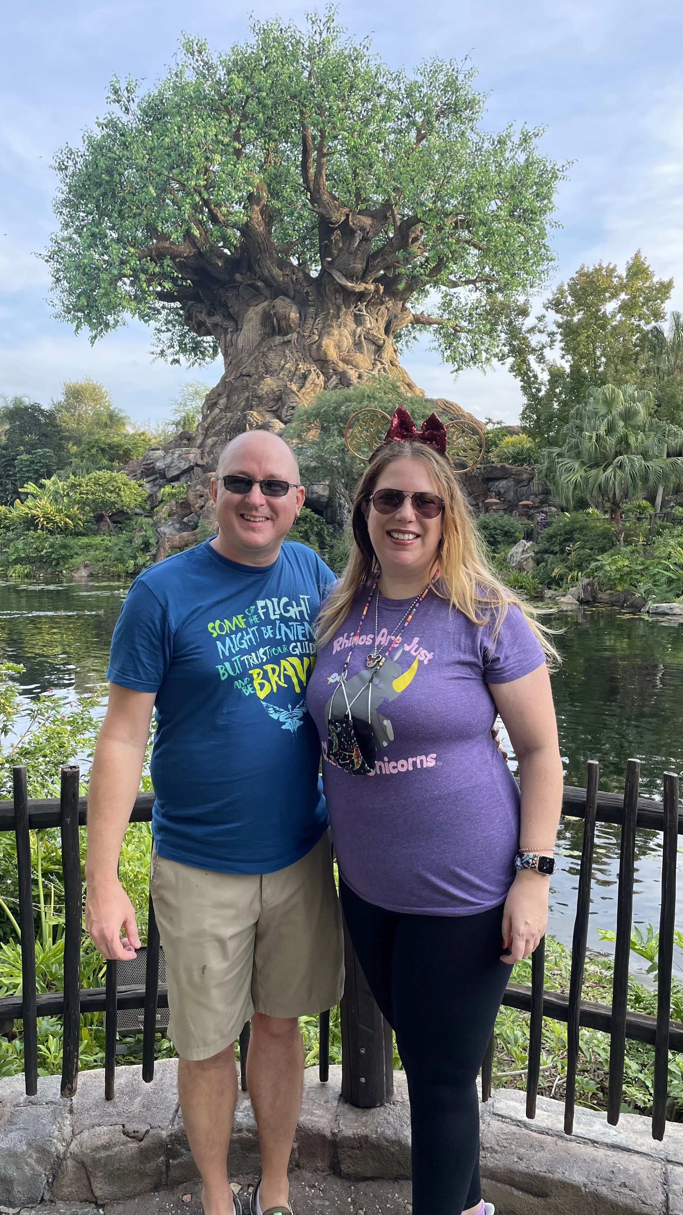 A man and woman standing in front of the Tree of Life at Disney's Animal Kingdom, with lush greenery and water behind them. The woman is wearing a purple t-shirt with unicorns and a headband with red glittery ears. The man is wearing a blue t-shirt a