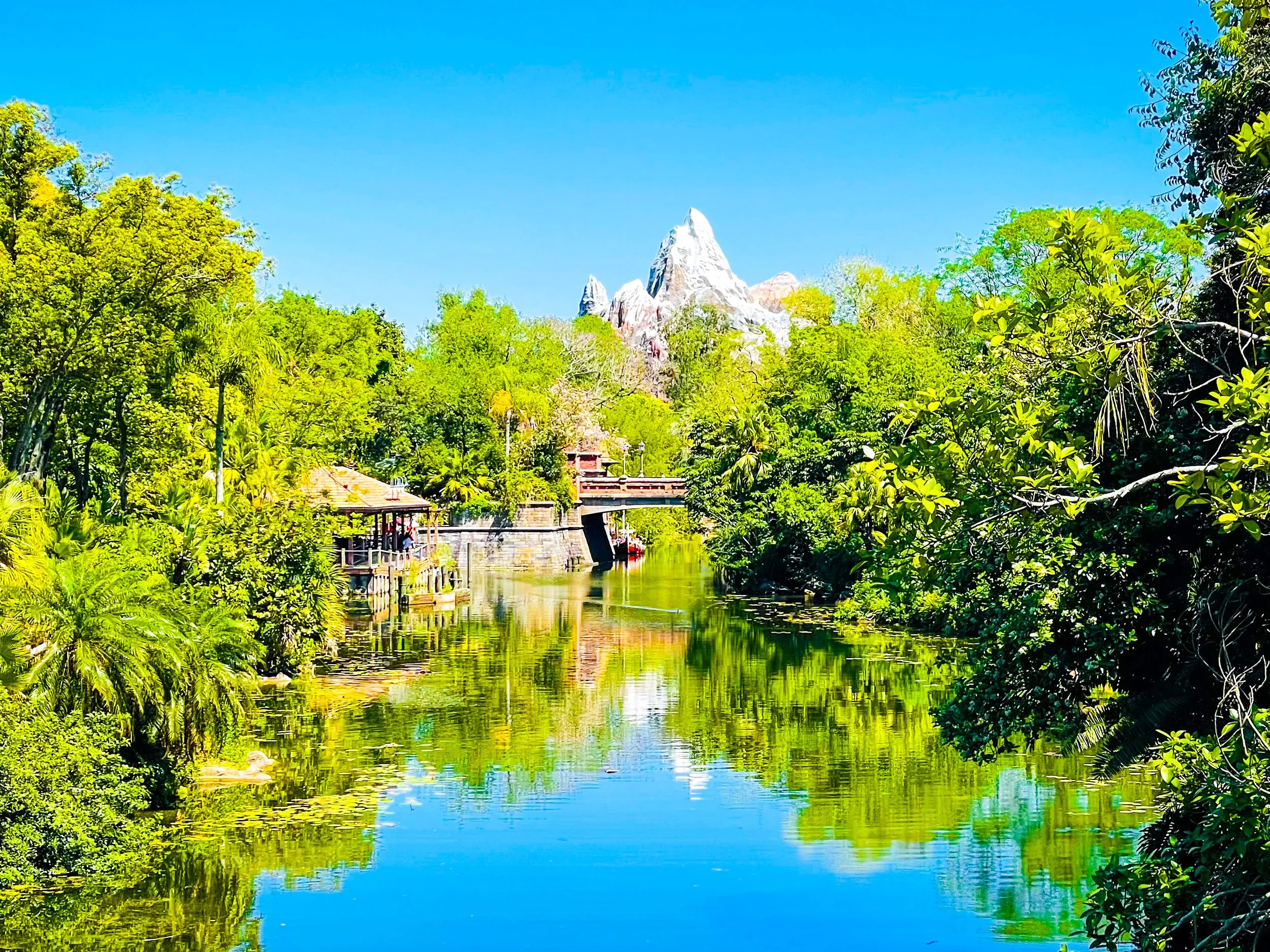 Lush green trees and shrubs surround a calm river with a mountain in the background under a bright blue sky.