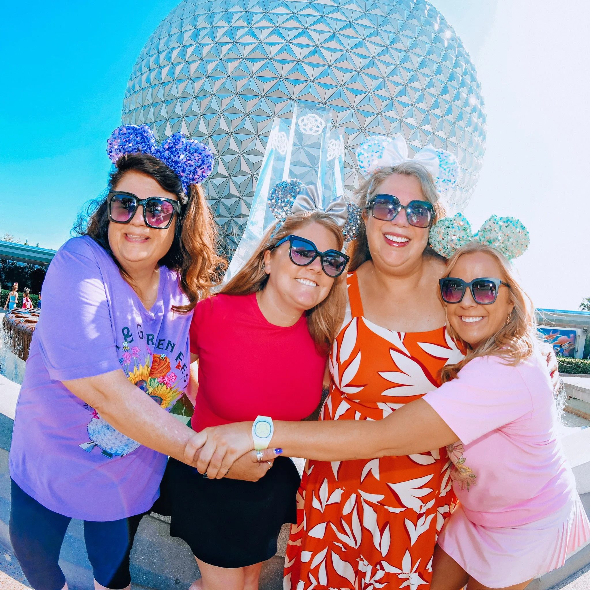 Four women hugging and smiling in front of Spaceship Earth at EPCOT, Walt Disney World, wearing colorful shirts, sunglasses, and Minnie Mouse ear headbands with sparkling decorations.