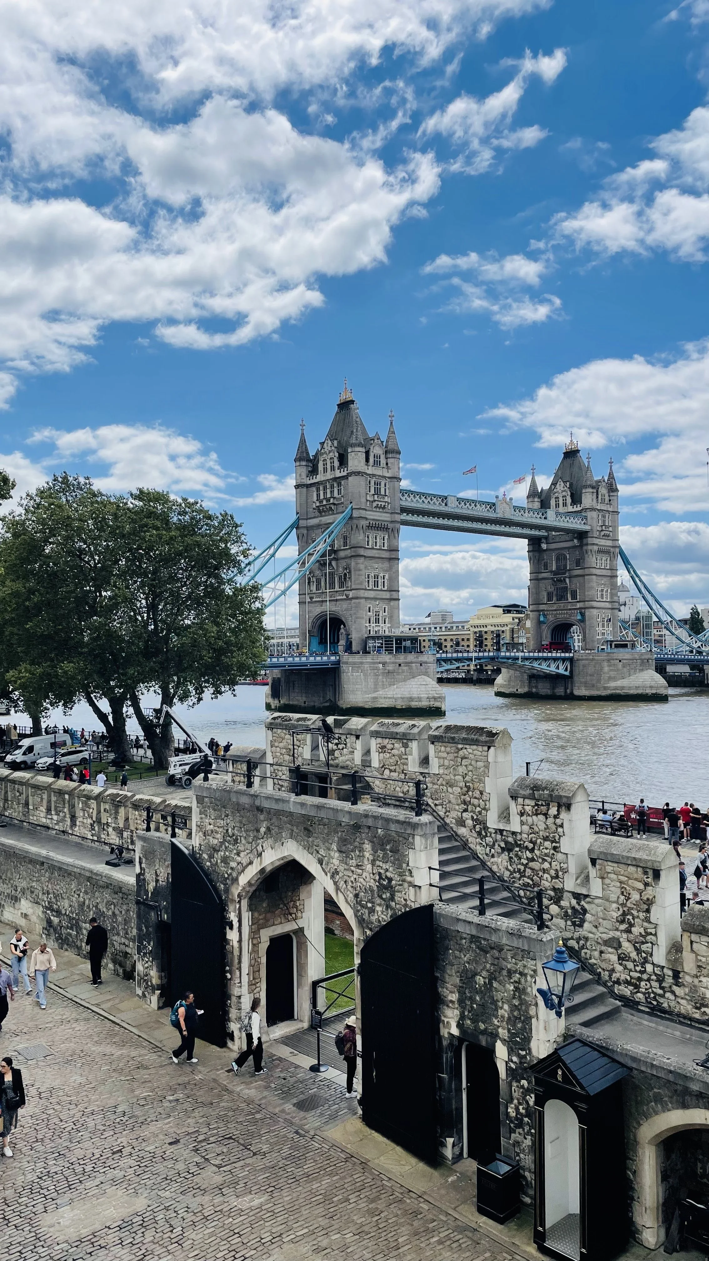 The Tower Bridge over the River Thames in London, with a cloudy blue sky, people walking on the cobblestone street, and trees nearby.