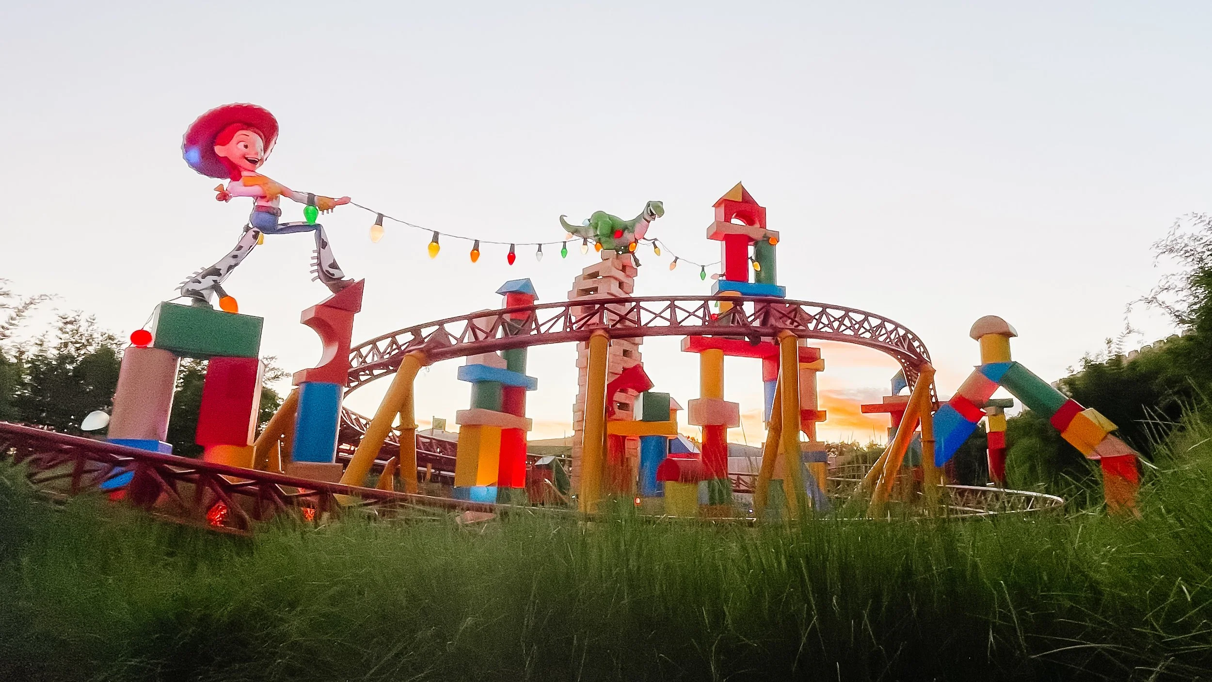 Colorful amusement park ride featuring a cartoon character holding a string of lights, with a small dinosaur figure on top, against a sunset sky.