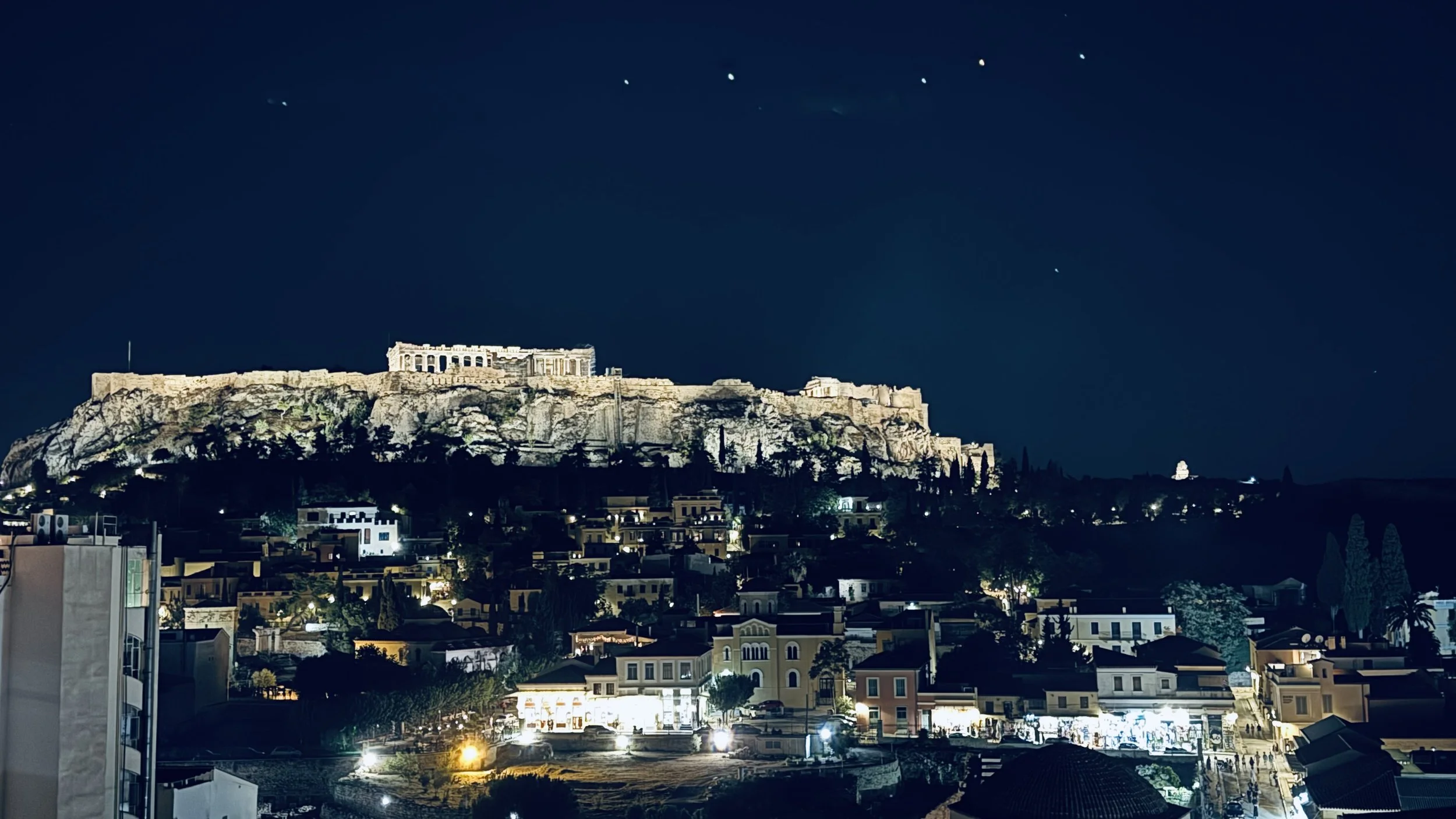 Night view of the Acropolis illuminated on a hill above a city with buildings, streets, and a dark sky with a few stars.