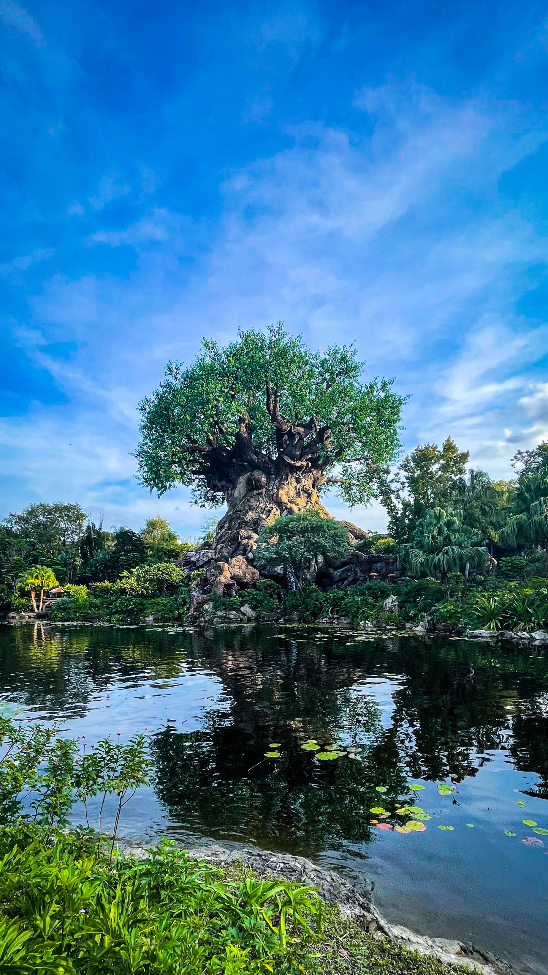 A large artificial tree with a thick trunk and lush green leaves standing beside a reflective lake, with tropical plants and a blue sky with wispy clouds in the background.