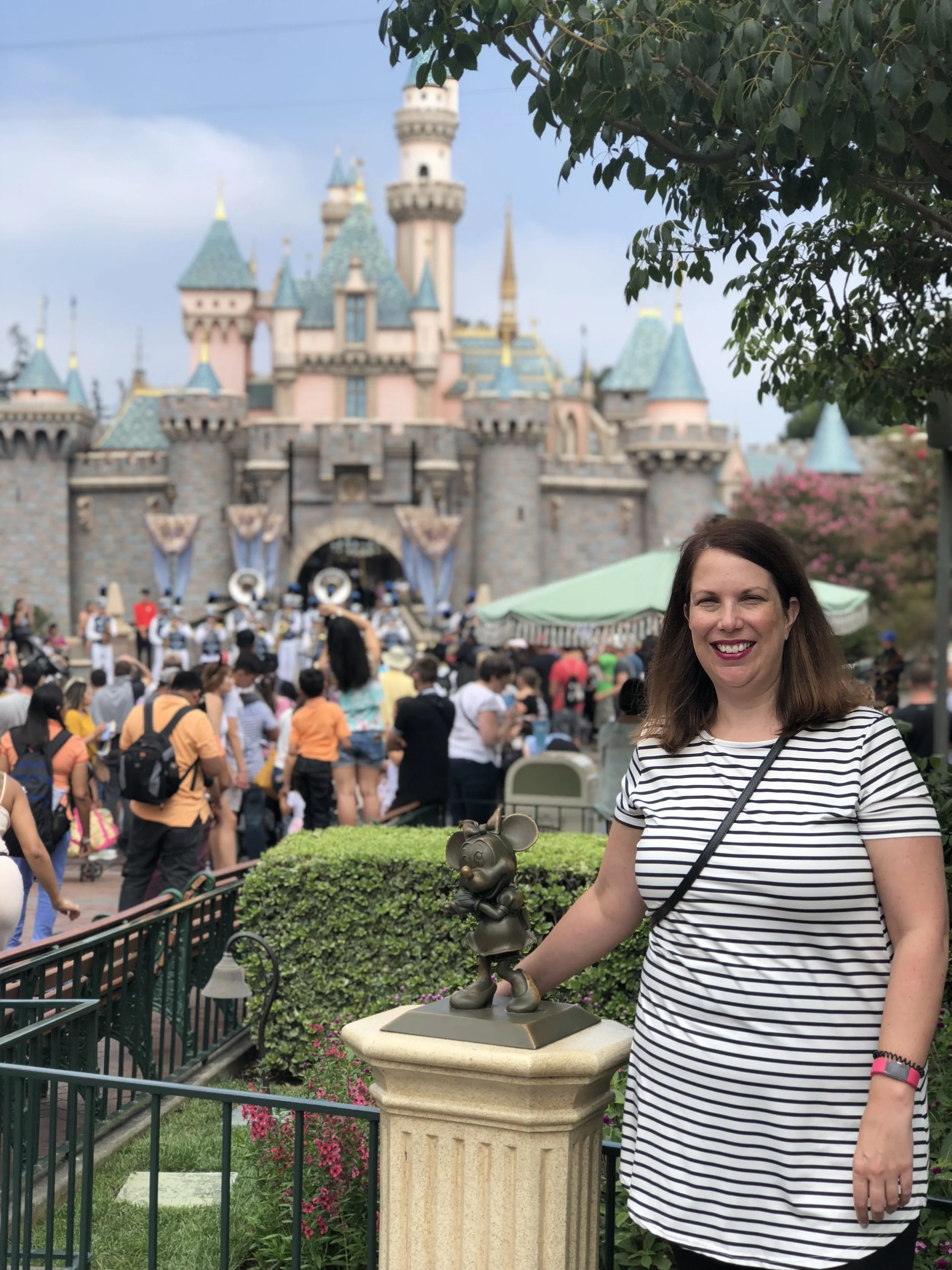 Woman smiling next to a Mickey Mouse statue at Disneyland with Sleeping Beauty Castle in the background and a crowd of visitors.