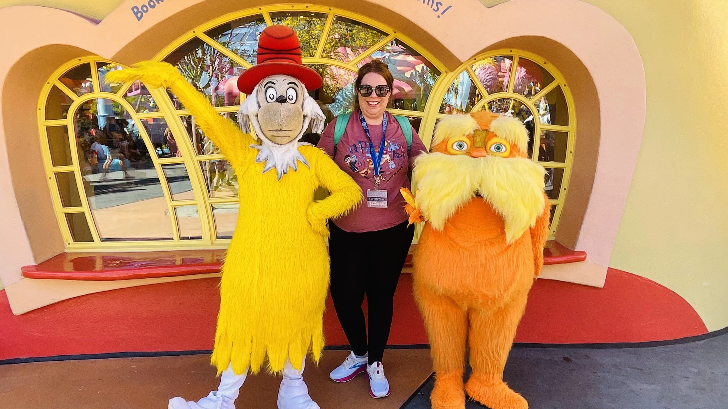 A woman with sunglasses and a maroon shirt standing between two characters in Disney costumes, Big Bird and a large orange monster, in front of a yellow window display at a theme park.