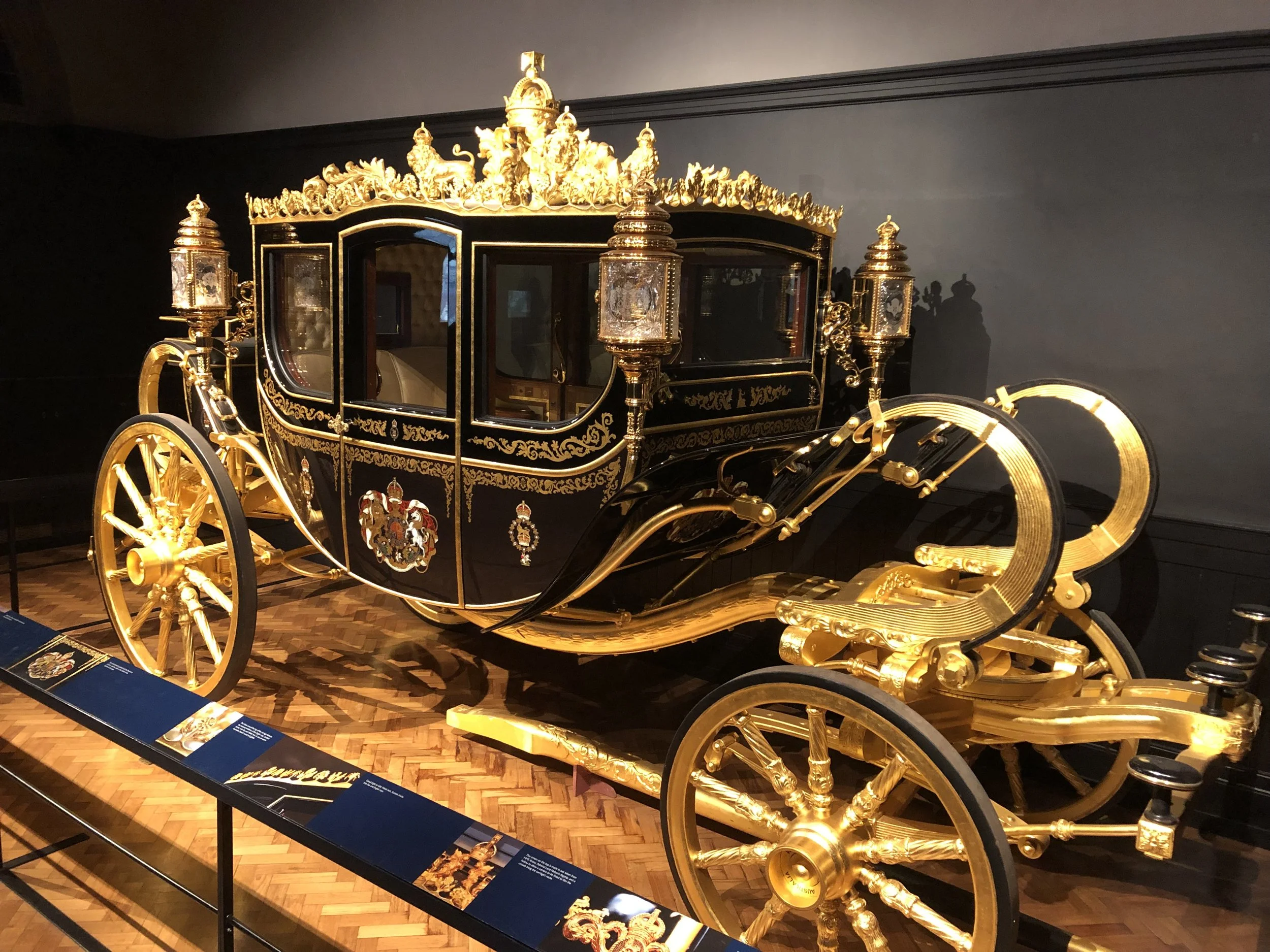 A royal coach with black and gold ornate design, gold wheels, and decorative lanterns on a display in a museum.