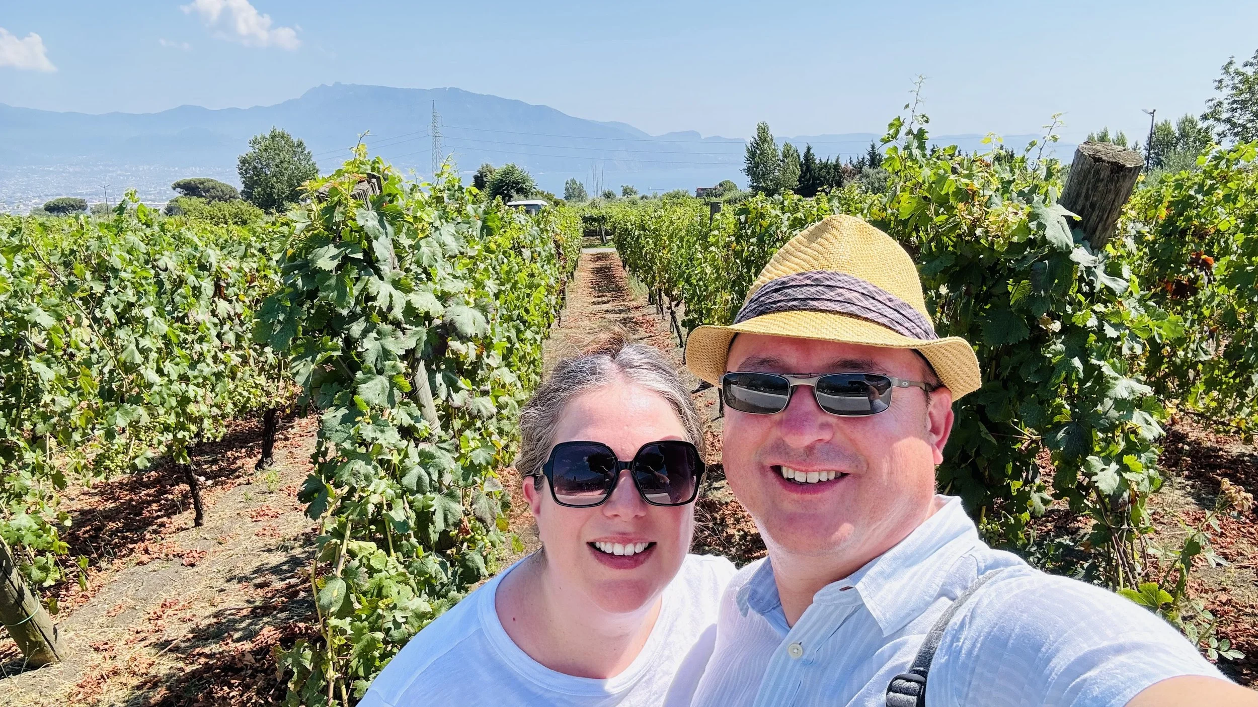 A smiling couple takes a selfie in a lush grape vineyard on a sunny day, with green vines and mountains in the background.