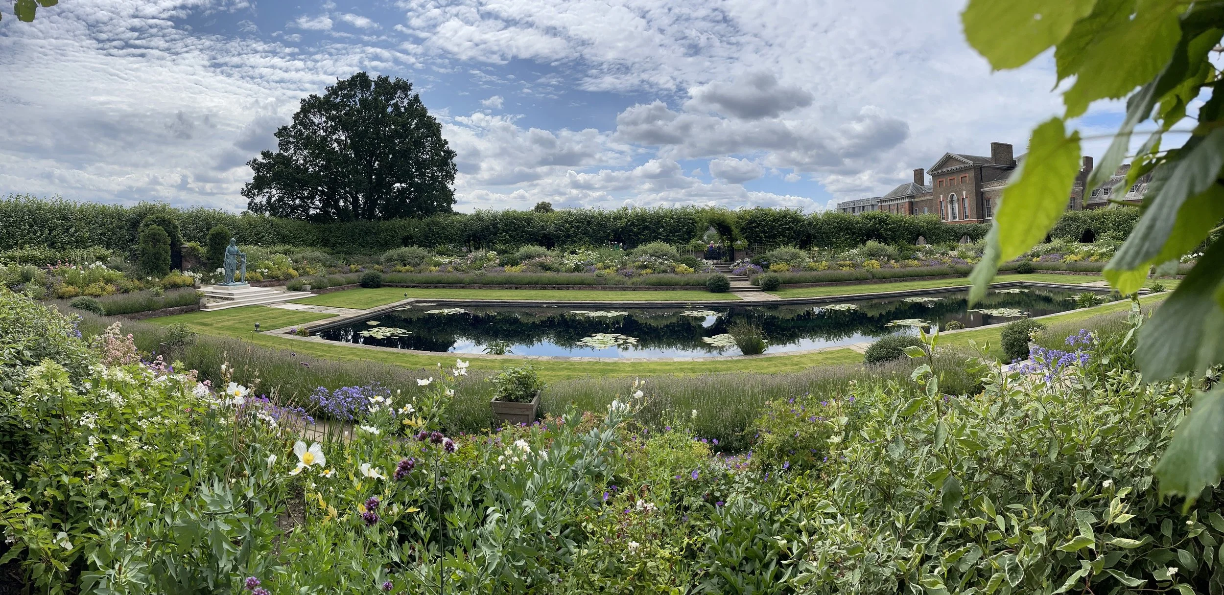 A beautifully landscaped garden with a pond, surrounded by lush green plants and colorful flowers, with a statue on steps and a large tree in the background under a partly cloudy sky.