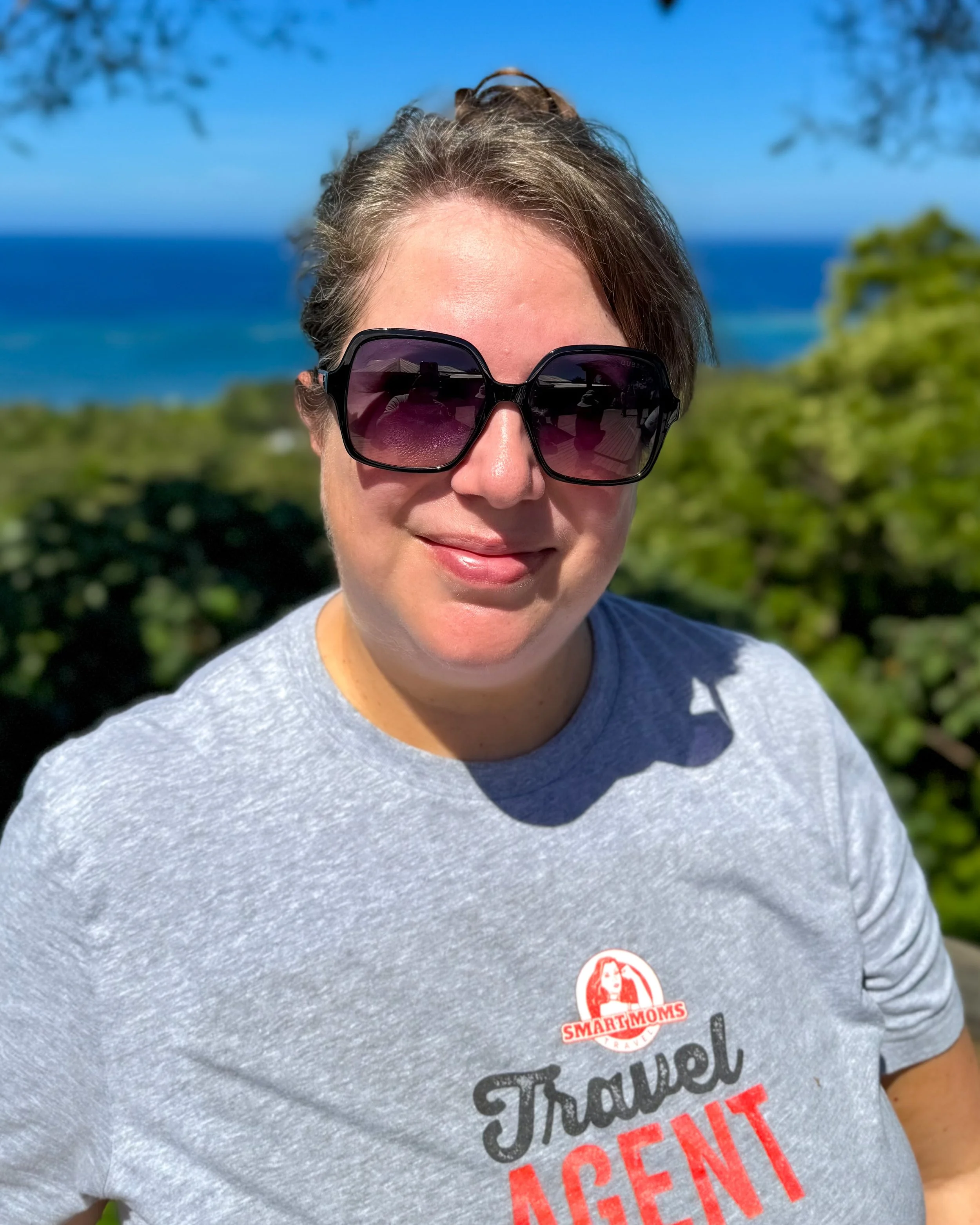 Woman wearing large sunglasses and a gray T-shirt with a logo, outdoors with greenery and ocean in the background.