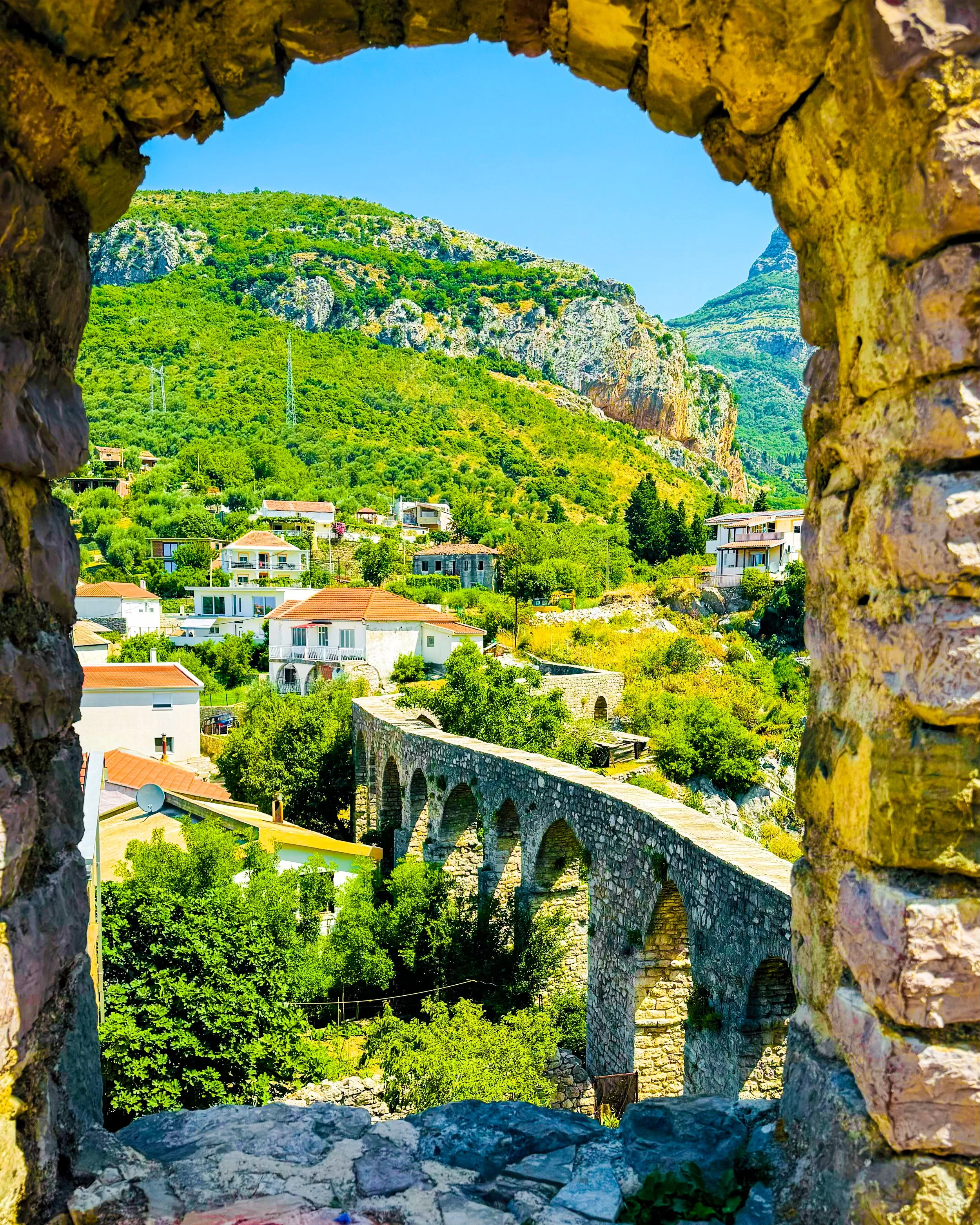 View of a village with white houses and red roofs, surrounded by lush green hills and mountains, seen through a stone archway.